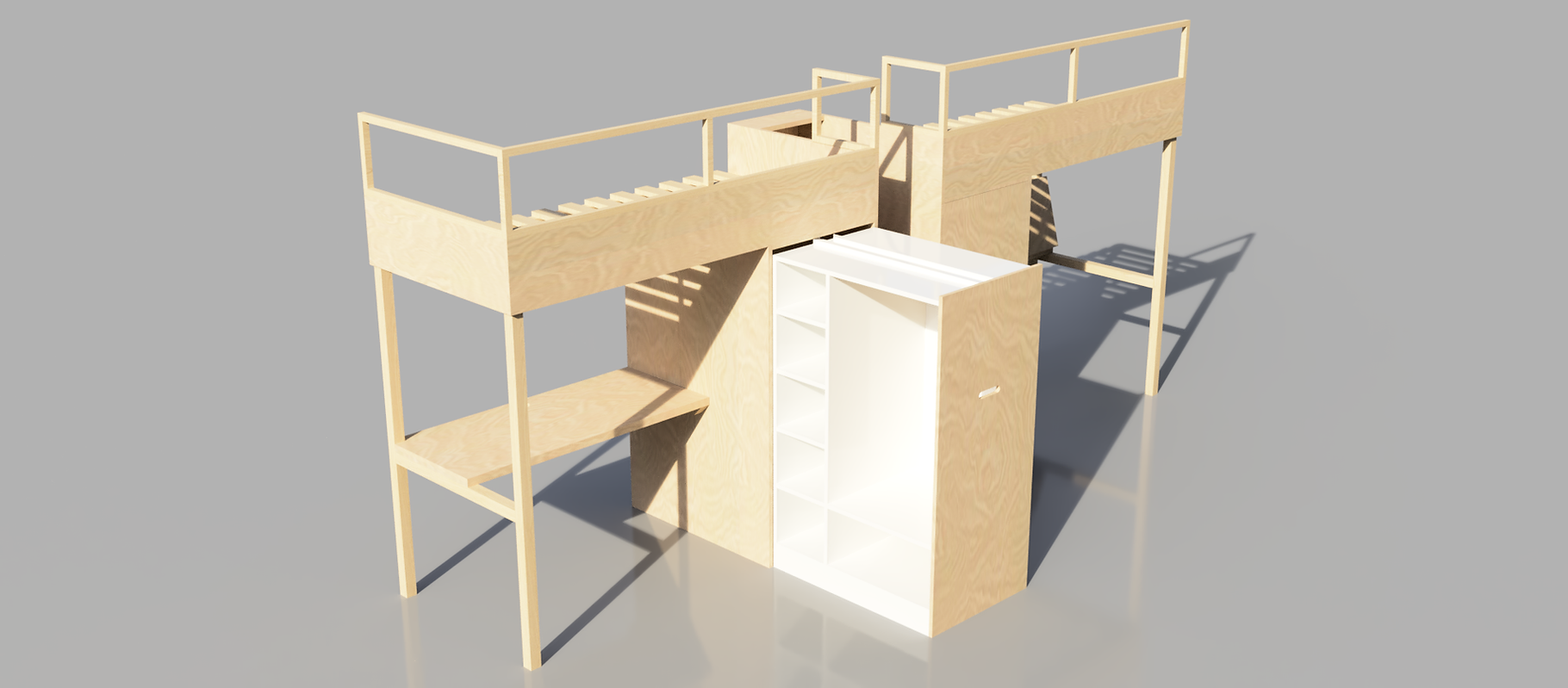 Conception détaillée, fabrication et pose de cet agencement de chambre d'enfants : Lits mezzanines, bureaux relevables, dressings coulissants et tiroirs sous escalier.