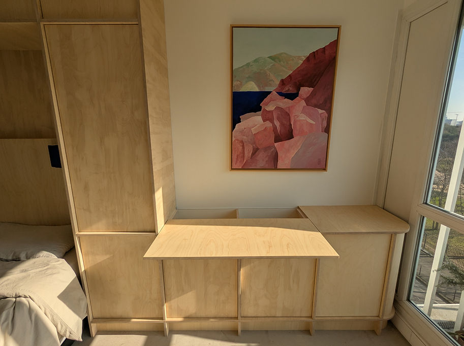 Conception détaillée, fabrication et pose de cet agencement de chambre : Tête et pont de lit, enfilade et bureau coulissant